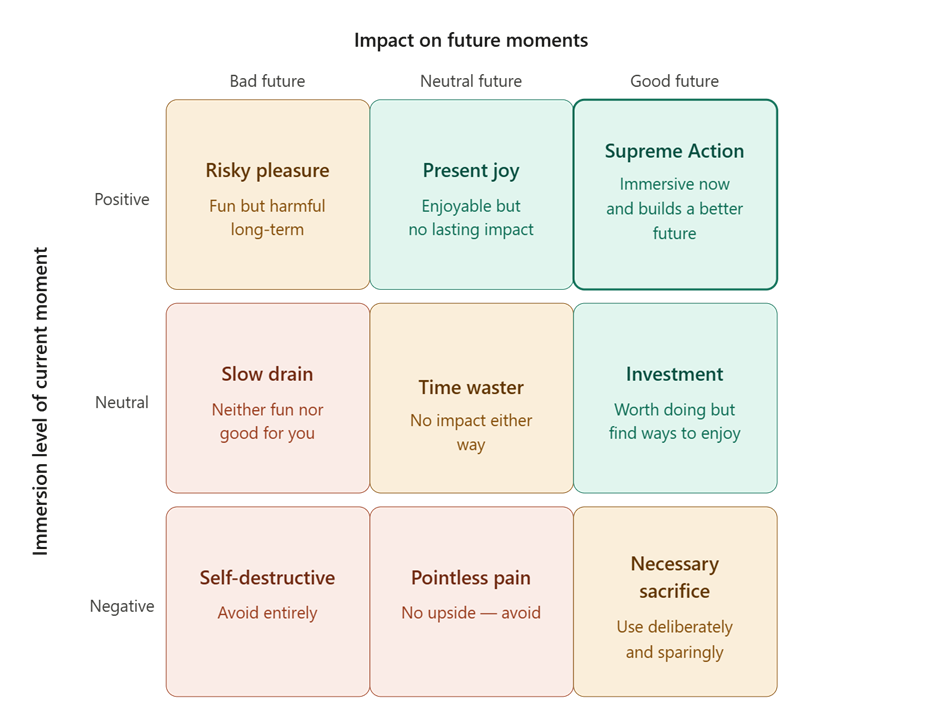 Supreme Actions are actions that immerse you in the current moment and simutaneously increase the potential of more immersive moments in the future.